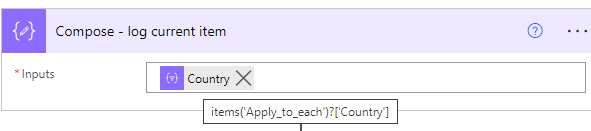 Create ‘Apply to Each’ and select outputs from previous steps which is Country Names. and inside add ‘compose’ action and log the current item. At first we will get the country value from the current JSON object.