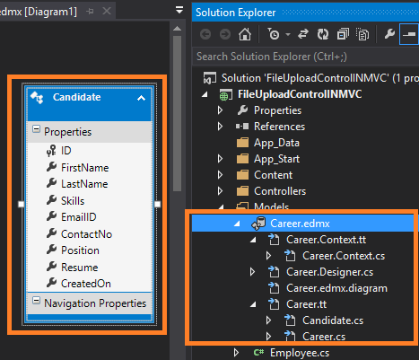 Here(Implement "Database First" approach with Entity Framework), I have already discussed how to configure and implement the database-first approach. In the meantime, choose your created table with Entity Framework. Once we are done with our configuration with SQL table "Candidates" from CRUD database, we will get the below screen as a succeeding configuration.
