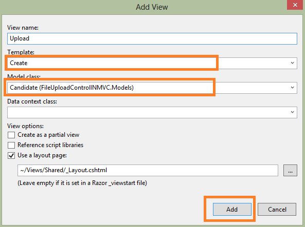 Okay! Now, create a strongly-typed View by right-clicking on Upload. You get the action method, just select Add View. Once you click "Add View", it will show the below screen. On the below screen, select Employee Model to create a strongly-typed View.