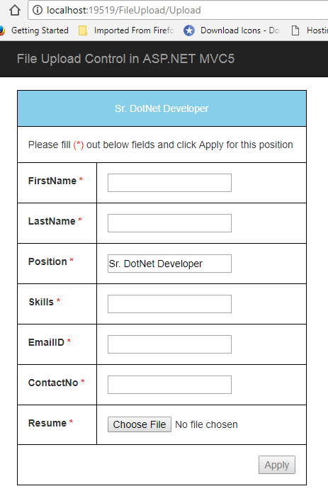 Now, we need to validate if the user entered all the required fields. So, add the below code to validate on Apply (Submit) button; click it and check whether you referred the jQuery from the head section or shared layout pages.