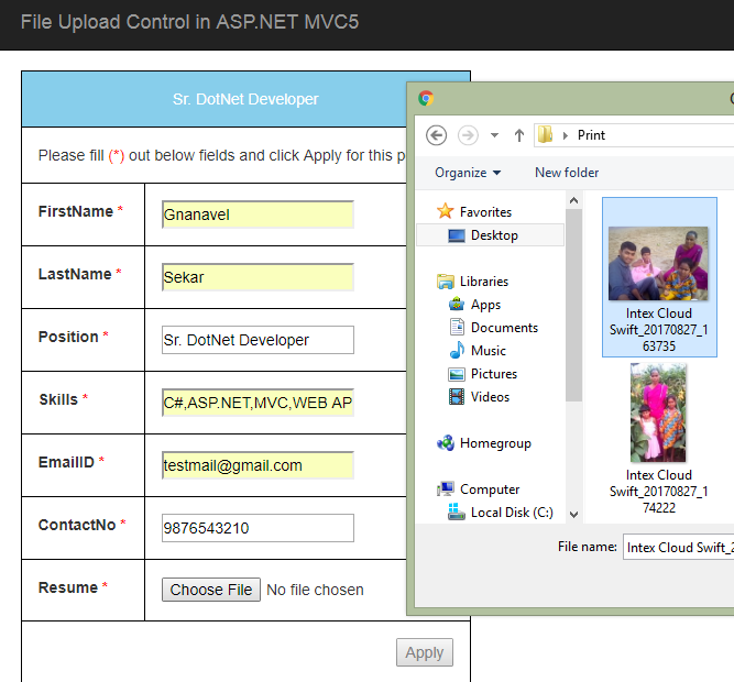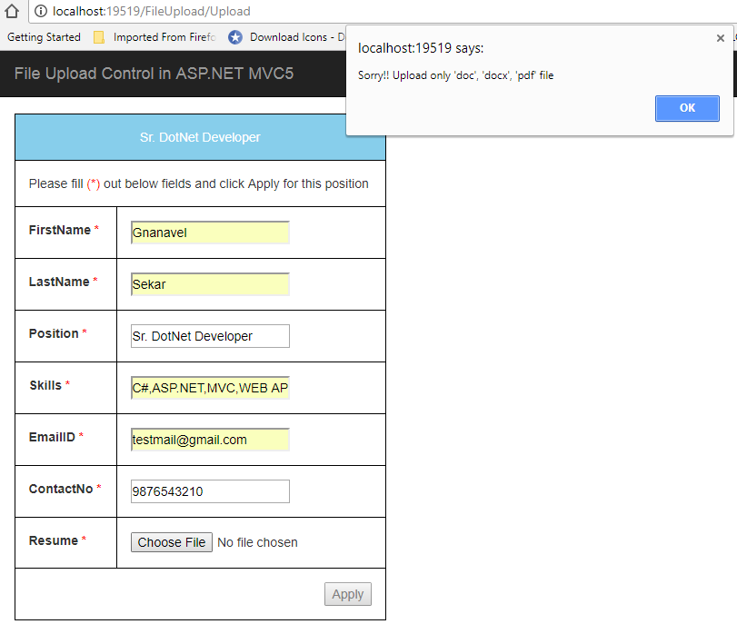 Now, fill out the form fields, try uploading different file formats. Here, I am trying to upload the image file. Let's see if our jQuery is working or not.