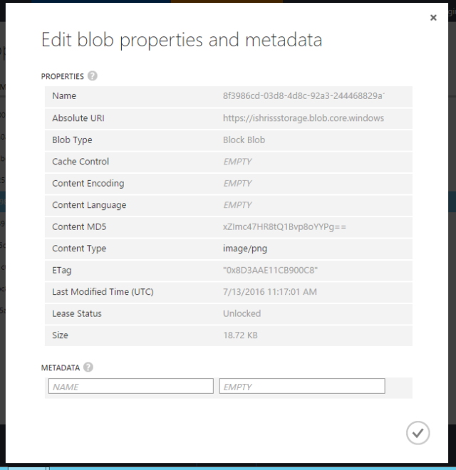 If you click on Blob's edit option, you can check Blob's metadata and the properties as follows: