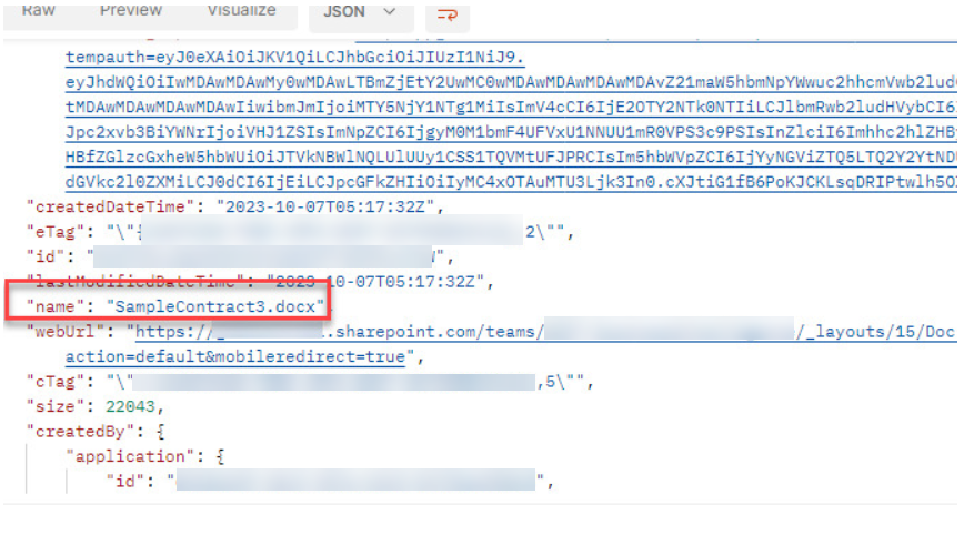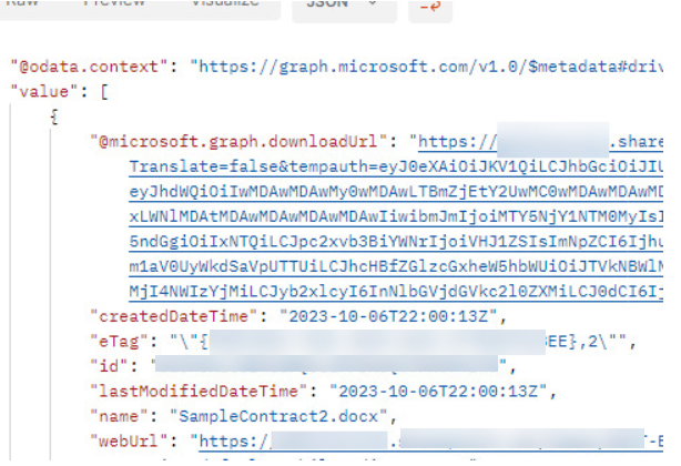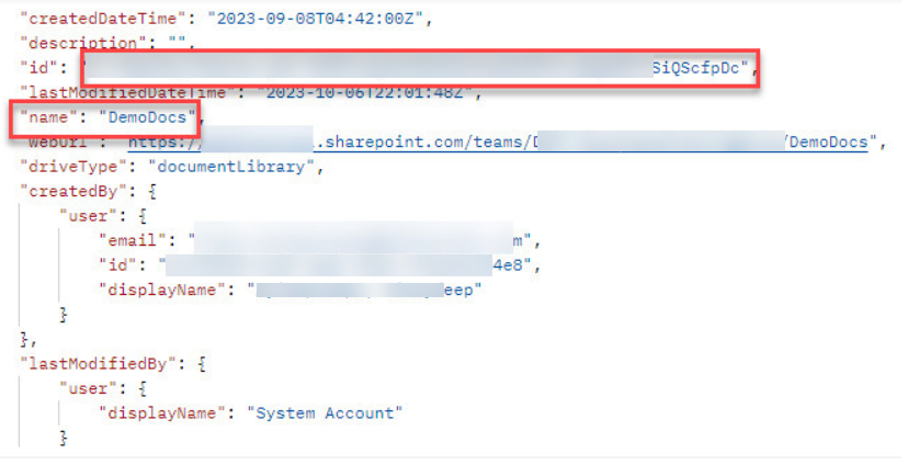 Step 8. On successful authentication, you should see all the document libraries and their properties in JSON format just like below. In this case note the ID of the document library that you want to test against. I am selecting ‘DemoDocs’ and the ID. In this case the ID I got from JSON response is b!LV8w2VS_Fk6rCur-pt2-OVDFDL8q3dtDh8JGmVbe8XKP33vrBqB4RYVSiQScfpDc