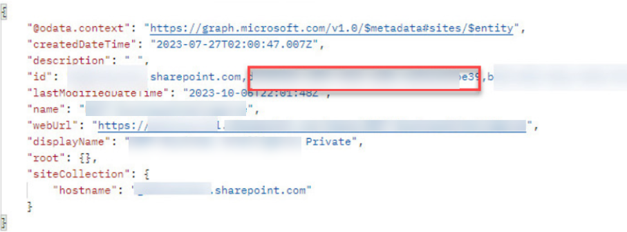 Step 6. Now click on ‘Send’. On success, you should see the message below in a JSON format, and the id column contains the Site Id value, which is the second string. Copy the Site ID. This will be used to retrieve the lists and libraries. In this case, the site ID is d9305f2d-bf54-4e16-ab0a-eafea6ddbe39.