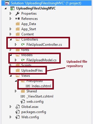 Right click on created ASP.NET MVC application, solution explorer and choose add new item, then Add New Folder. After adding the model, view, controller and UploadedFiles folder to save the file. Solution explorer will look like as follows,