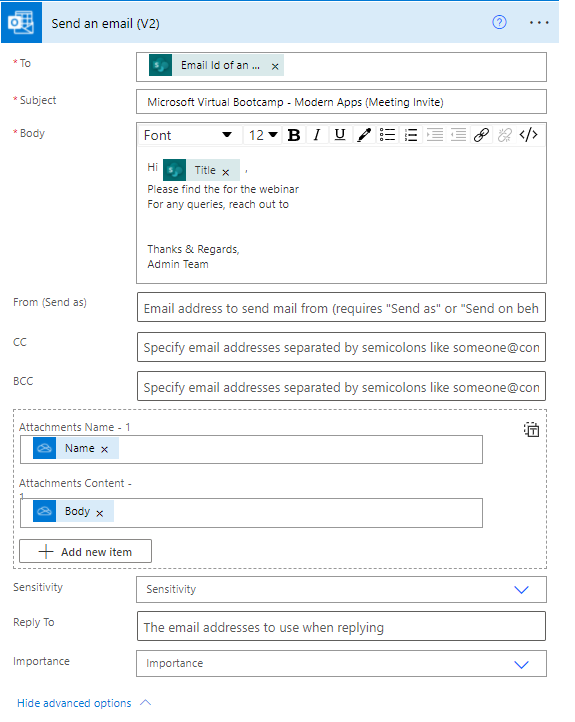 Now let’s add (.ics) calendar file as an attachment. Select Attachment Name as Name dynamically from OneDrive File metadata and Attachment Content as Body from OneDrive File Content.
