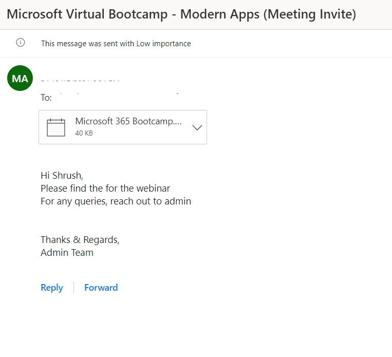 In this article you will see a few easy steps which will take attendees data from Microsoft Form > Store data in SharePoint List > Store the calendar invite (.ics file) in OneDrive > send the invite to attendee via mail