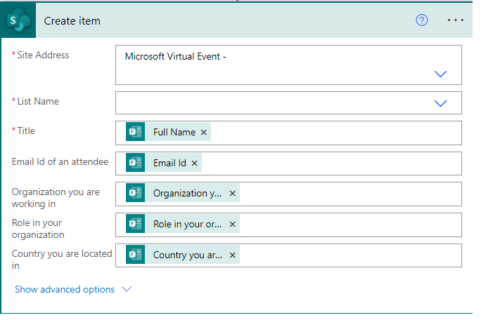 Step3: Now you have the response of each attendee from the above step, So, let's store the attendee data in SharePoint list. For this, choose ‘Create an item’ SharePoint connector