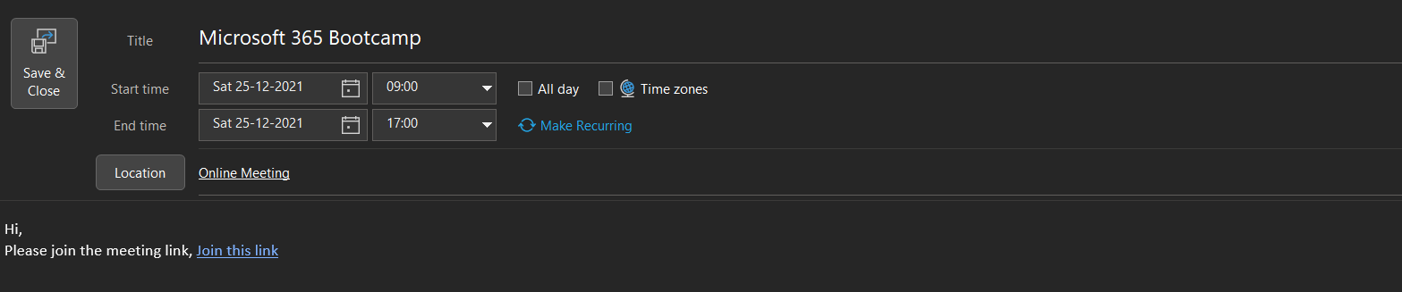 Navigate to your Outlook desktop app > create new appointment > with meeting start time and end time and meeting link as shown in Fig 1.7.