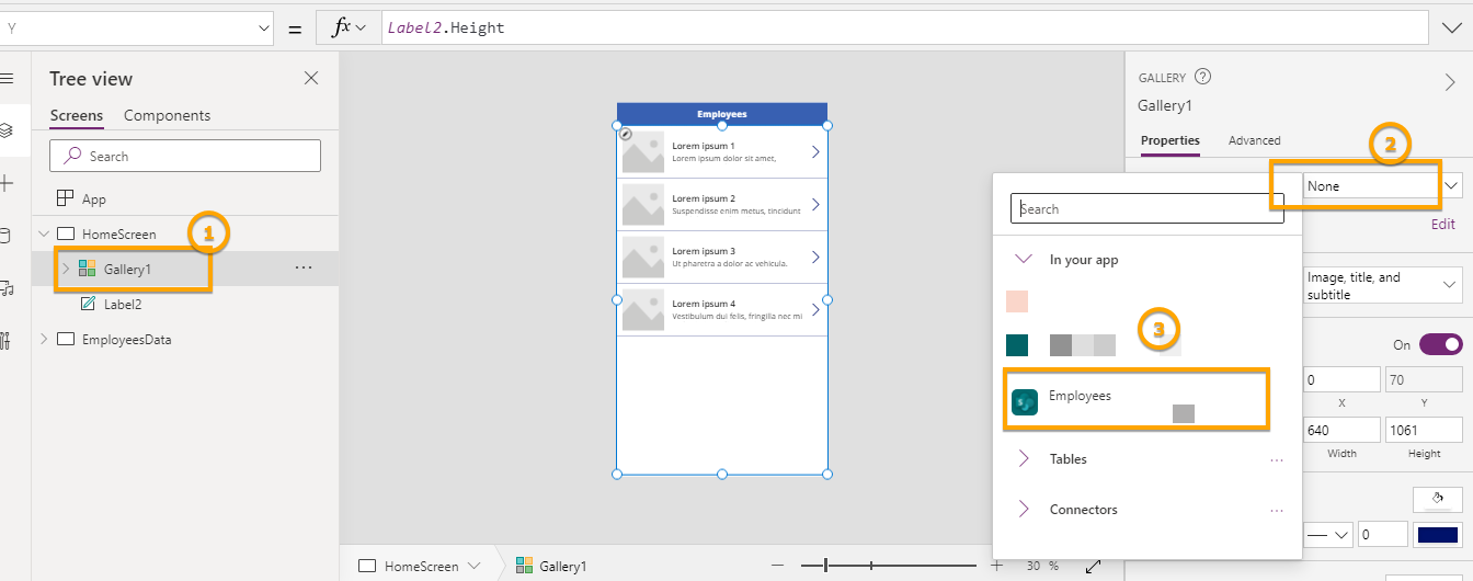 Now after inserting Gallery, Select Gallery > Right Panel select Data Source as Employees