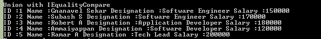 Now we need mention the class in union extension method which implements IEqualityComparer interface, here we implmented in EmployeeComparer class,