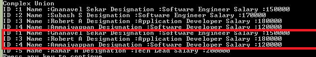 In the above result you can see, there are the duplicate values, the union extend method doesn't perform its unique operation with large collections because it doesn't know which field to compare, so we need to specify which field to compare. To overcome this problem "IEqualityComparer" interface