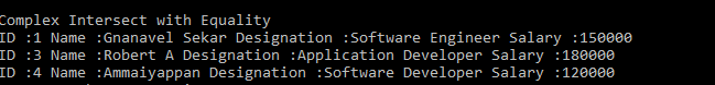 - var intersectEqualityComplexResult = employeeCollection1.Intersect(employeeCollection2,new EmployeeComparer());