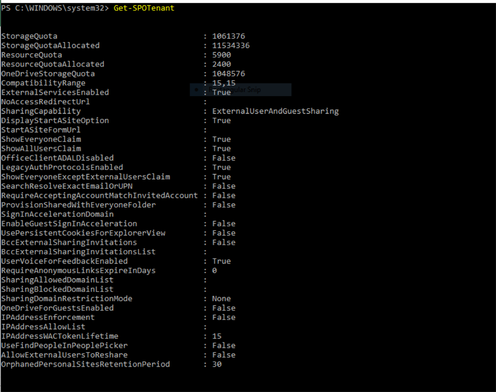 Syntax: Get-SPOTenant