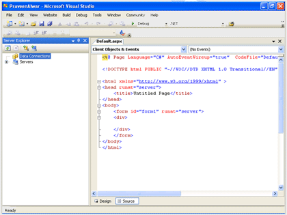 You can see that the "Data Connections" in the Server Explorer which is at the left hand side of the window is empty and doesn't contain any tables or any of the data elements. This is how your Server Explorer looks if no database is connected to your application. In the later stages of this article, you can see the modifications to the "Data Connections".