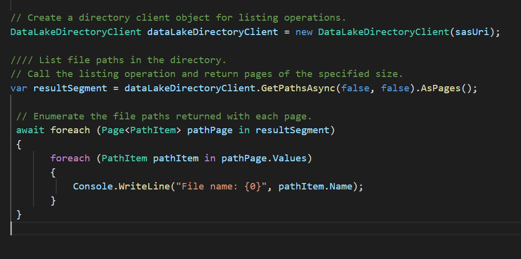 Create a Data Lake Service client as below (using tenant ID, client ID and secret created in step 1) .In endpoint, pass data lake endpoint created in step 2.