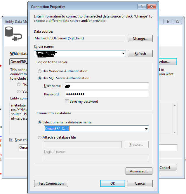 - In the given box type entity name as SahilEntities and After that click New connection.