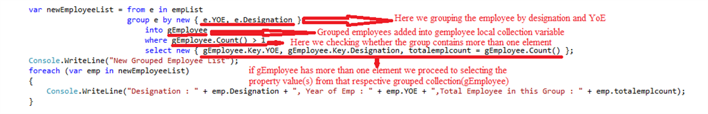 - select new { gEmployee.Key.YOE, gEmployee.Key.Designation, totalemplcount = gEmployee.Count() }; -> if more than one element exists in the temporary variable of collection, we proceed to select the value from that respective collection. Here, we are saying to select YOE, Designation, and total employee count in that respective group.