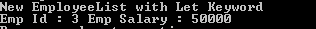 - Console.WriteLine("New EmployeeList with Let Keyword");