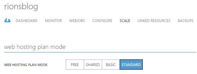 Log into your Azure Web Portal and select the site that you want to apply this domain to. Shortly after logging in, click the Scale tab that appears along the top menu. Clicking Scale will present you with various settings regarding how to scale-out your application or site as seen below,