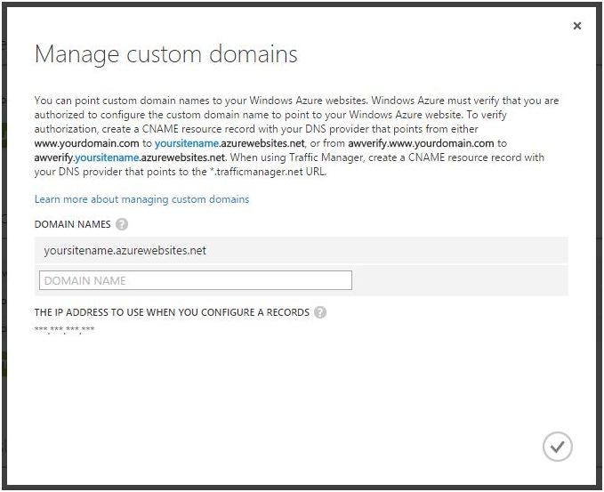 Clicking the Manage Domains button will present you with the following dialog that will mark the beginning of a few steps of bouncing between your Azure site and the DNS settings of your domain provider (e.g. namecheap.com).