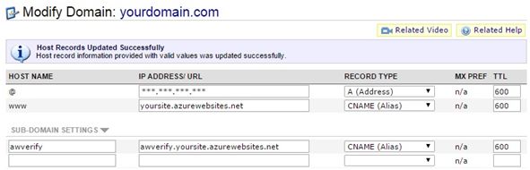 You’ll need to create an alias under the sub-domain section called awverify that points to the awverify sub-domain for your site (e.g. awverify.yoursite.azurewebsites.net).