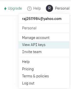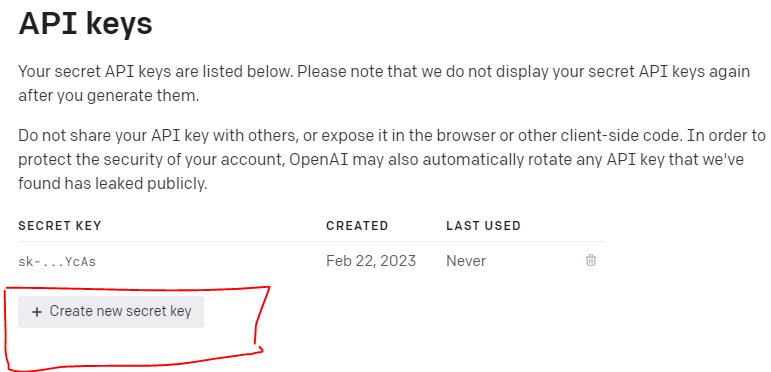 - Create a new secret key so the python application can connect to API. Click on Create new secret key button and copy the key somewhere safe.