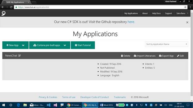 Step 1 - Login to www.luis.ai using your Microsoft Account. (If you have already created an application using Microsoft account, then use the same). We will get the below screen. Here, we can find the application that we have created earlier.