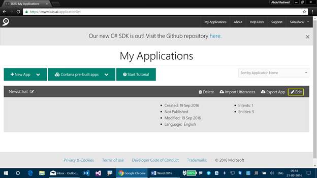 Note- I created a LUIS Application by the time of my previous article. So, we will be working on the same, to create Composite Entities if you don’t have an application to create a new one.