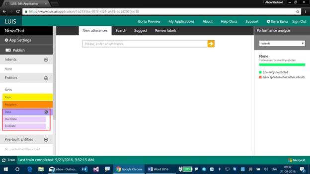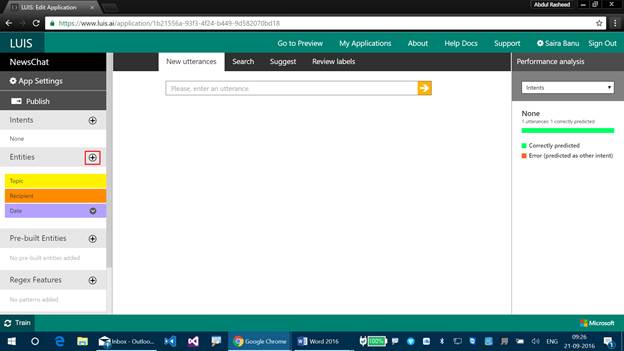 Step 3 - Let's label the Composite Entities now. We know that the Composite Entities can work either individually or even with Combined Entities, and now we will be labeling it. Let's create a new Utterance now as “Search news about India for 2 days”.