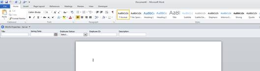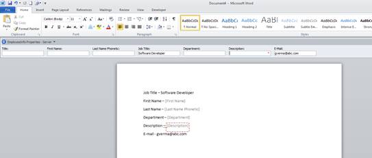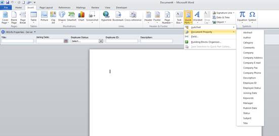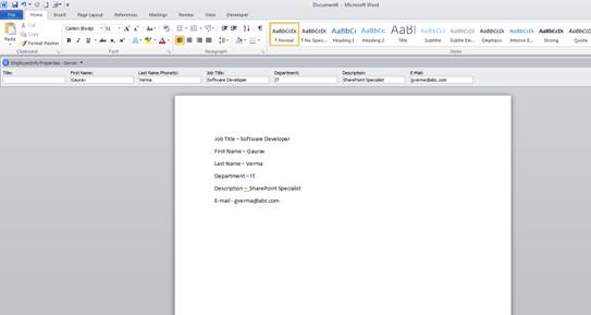 Now, when we open the template, we can see Document panel above which columns are there what we added to the HRInfo content type.