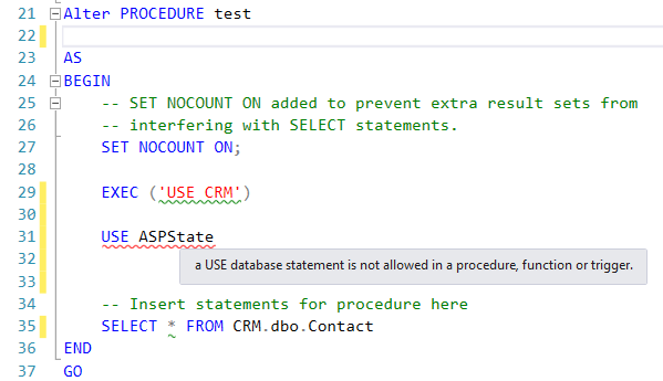 if we try to use a USE statement in a stored procedure, we will see the error like above.