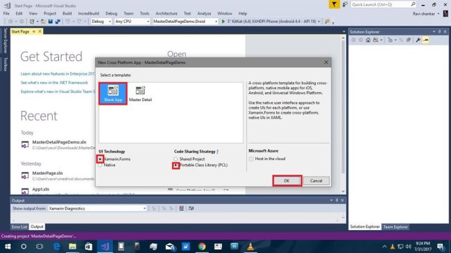 When New Cross Platform App is created then click on BlankApp. We need to select xamarin.forms next select Portable class library (PCL) go to click on button.
