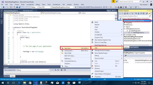 Select MaterDetailPageDemo right click to more options available select add option extract to click on New Item…