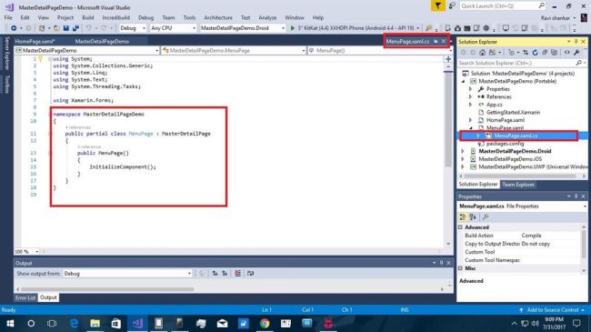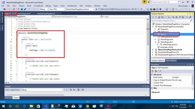 Click on calling or App.cs Page. App page is declared within Home Page and Menu page calling condition.So Compile process completes to create a masterpage
