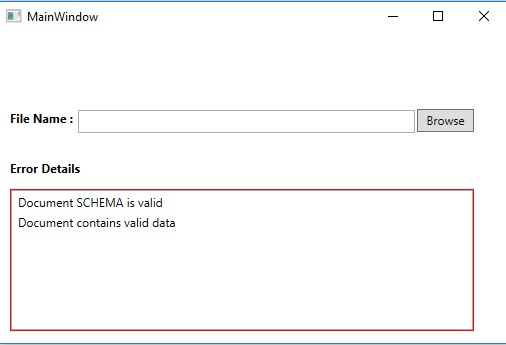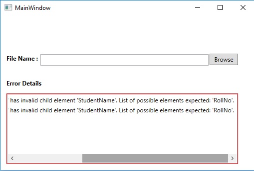 Take controls like textbox, textblock, button, and list box like below image. The textbox and button are taken in this demonstration to browse the Excel file and list box whose border color is red for displaying the messages.
