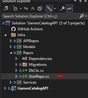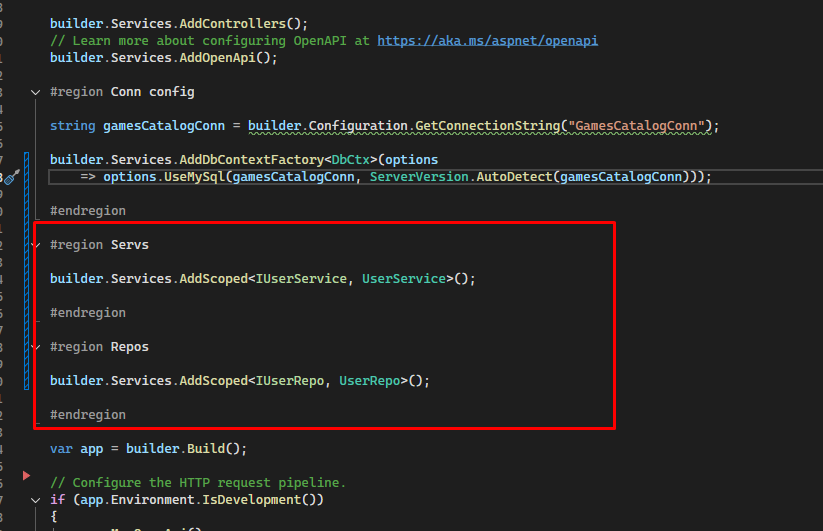 Step 5. In the Program.cs, let's add UserService and UserRepo to the Dependency Injection (DI) container:
