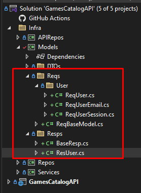 We'll have two folders: Requests and Responses. Inside Requests, we'll create a folder for the user models. The user models will be divided into separate parts that can eventually be used individually: