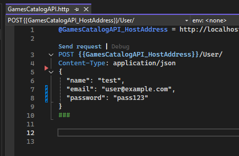 Step 6. Update the GamesCatalogAPI.http file to insert a test for the user creation POST request: