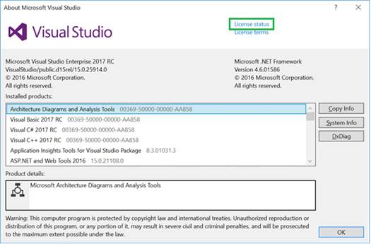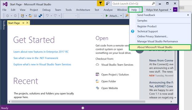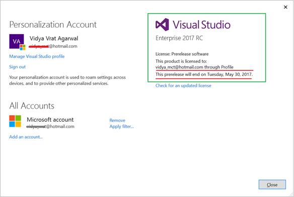 Microsoft launched Visual Studio 2017 RC on November 16, 2016 and it’s a free trial for all .NET enthusiasts and the developer community. Once a developer downloads the free trial, it's only valid for certain period and this article will help you to learn how to check the validity date of VS 2017 RC.