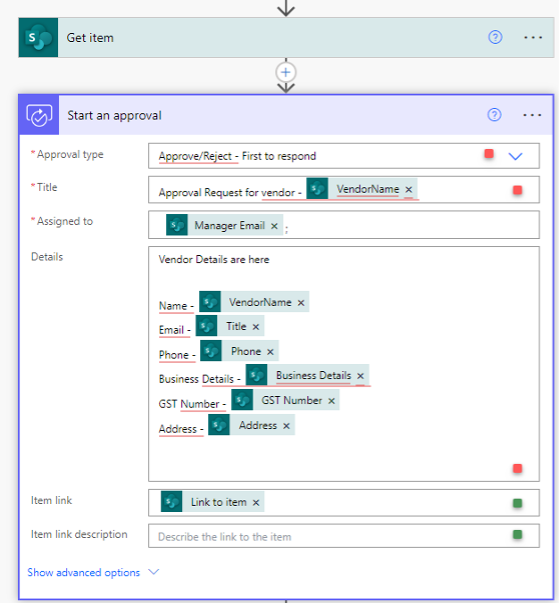 - Title - Approval Request for Vendor – Vendor Name (This title you can use as per your approval process and dynamics content using pick from ‘Dynamics content’ box from section ‘Get Item’)