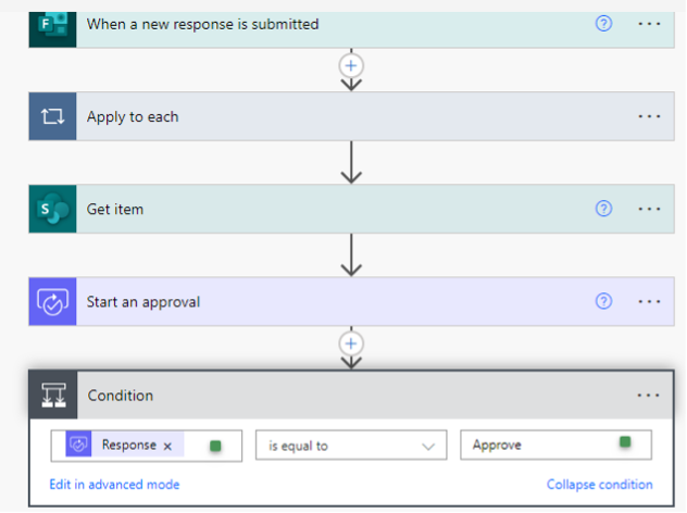 Add a ‘condition’ step, add ‘Response’ using the dynamics box in the first condition box add condition ‘is equal to’, and in value condition part set ‘Approve’.