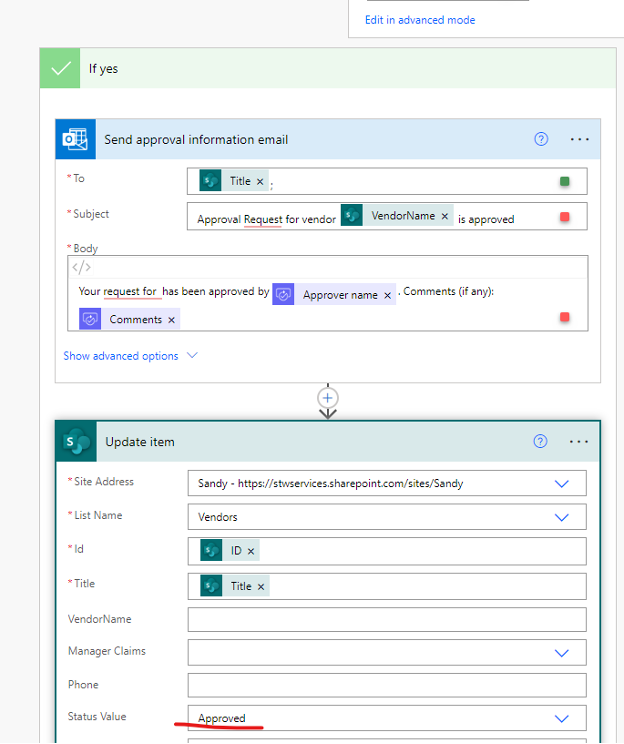 Now in ‘if Yes’ the true value case of condition box send email to vendor for approval confirmation using action step ‘Send an email (V2)’ from Outlook connectors. and then update SharePoint Vendor List Item for ‘Approved’ status.
