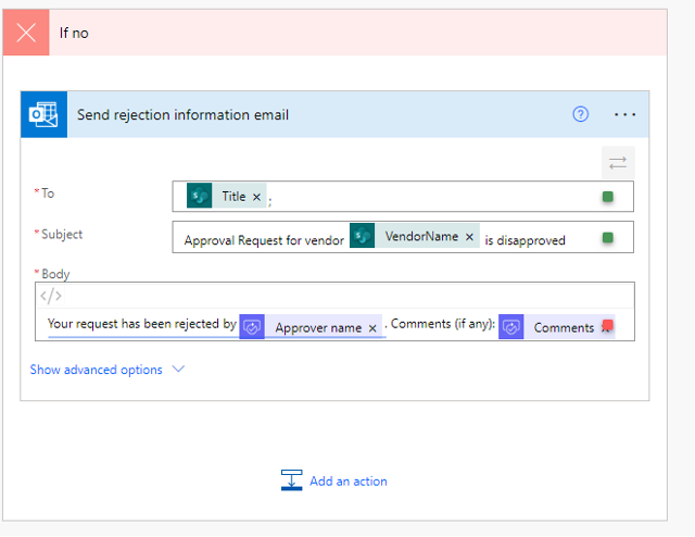 Now in the ‘If No’ part of the condition box also send an email to the vendor that your request is rejected using the same process. Add action step ‘Send an email (V2)’ from Outlook connectors. And step inputs like -