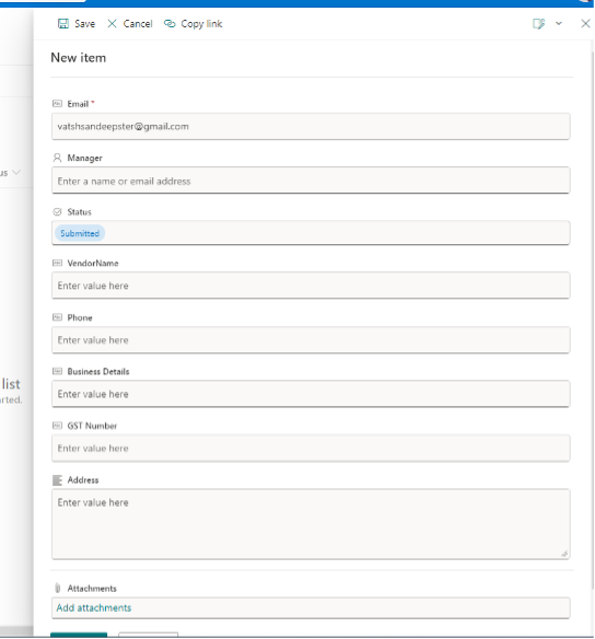 Step 1. Add a vendor in SharePoint ‘Vendor List’ just add an email address so one email will be sent to the vendor for submitting his details. Also add Manager who will approve vendor in Manager column.