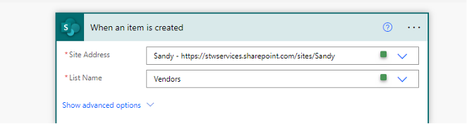 Select SharePoint Site and targeted list for this process. In our case, I used my demo site ‘Sandy’ and List name – ‘Vendors’. Throughout this demo, I will use the same list and site. You can refer to yours accordingly.