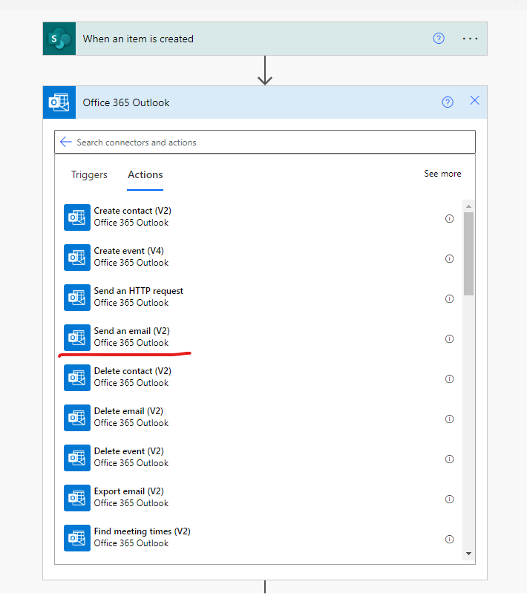 The subsequent action is to write an email to the vendor and attach the registration form in order to obtain the necessary information. The manager will provide their approval based on such information. For the same – Add send an email (V2) from the outlook connector.