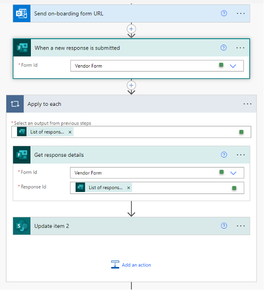 Add a new step and apply to each to get a response from ‘Vendor Form’ and add new step ‘Get response details’