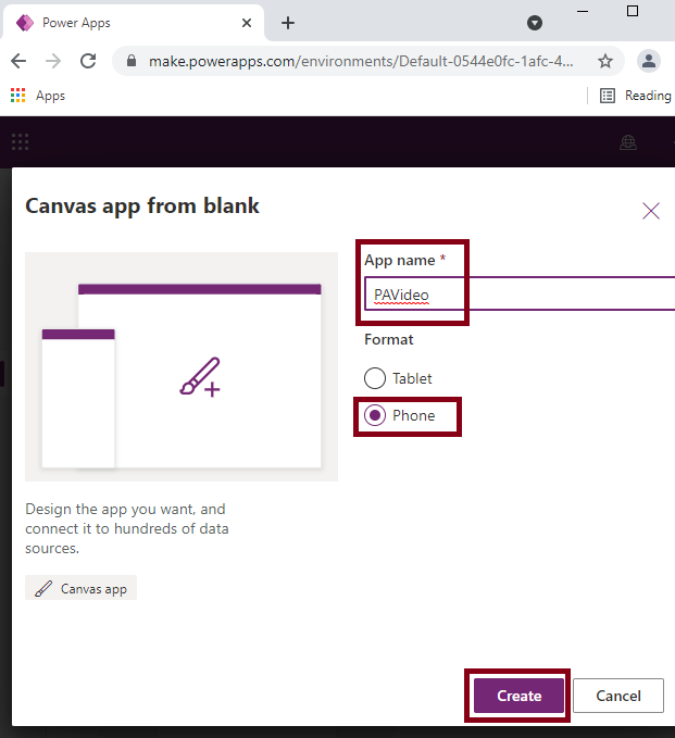 Next, give the App name as PAVideo and format as Phone, and then click on Create.