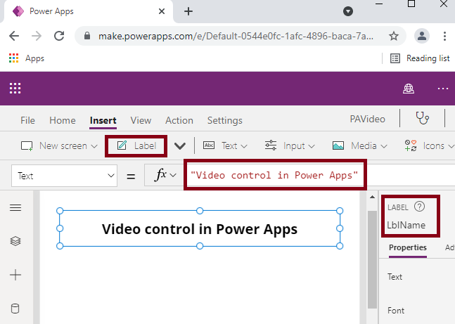 Insert the Label Control and set the Name property as LblName and Text Property as Video Control in Power Apps.